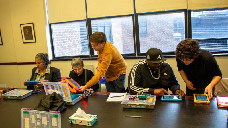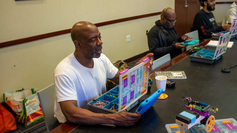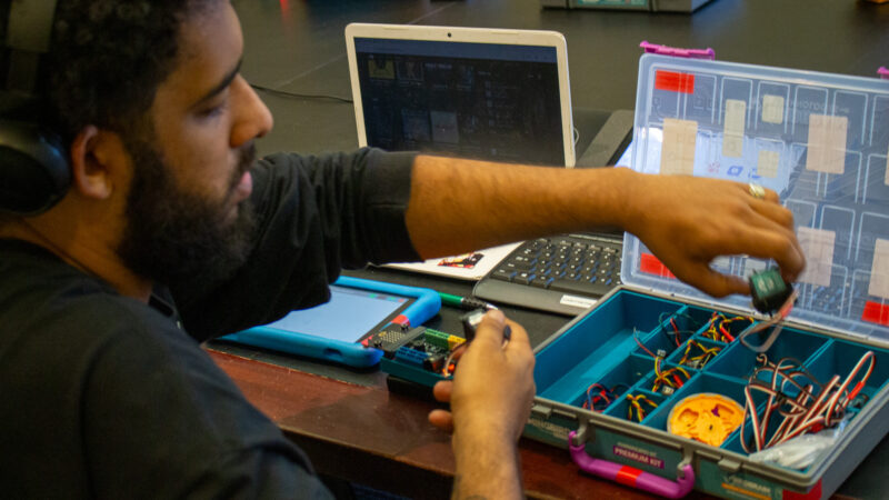 The teachers also introduced participants to their individual hummingbird kits, which include lights, sensors and other materials for building. In each workshop class, participants will build a new robotics project using these materials and continue to build upon their foundational skills. Many of the participants enrolled in the workshops are beginner coders, and the classes will help them master some fundamental concepts.