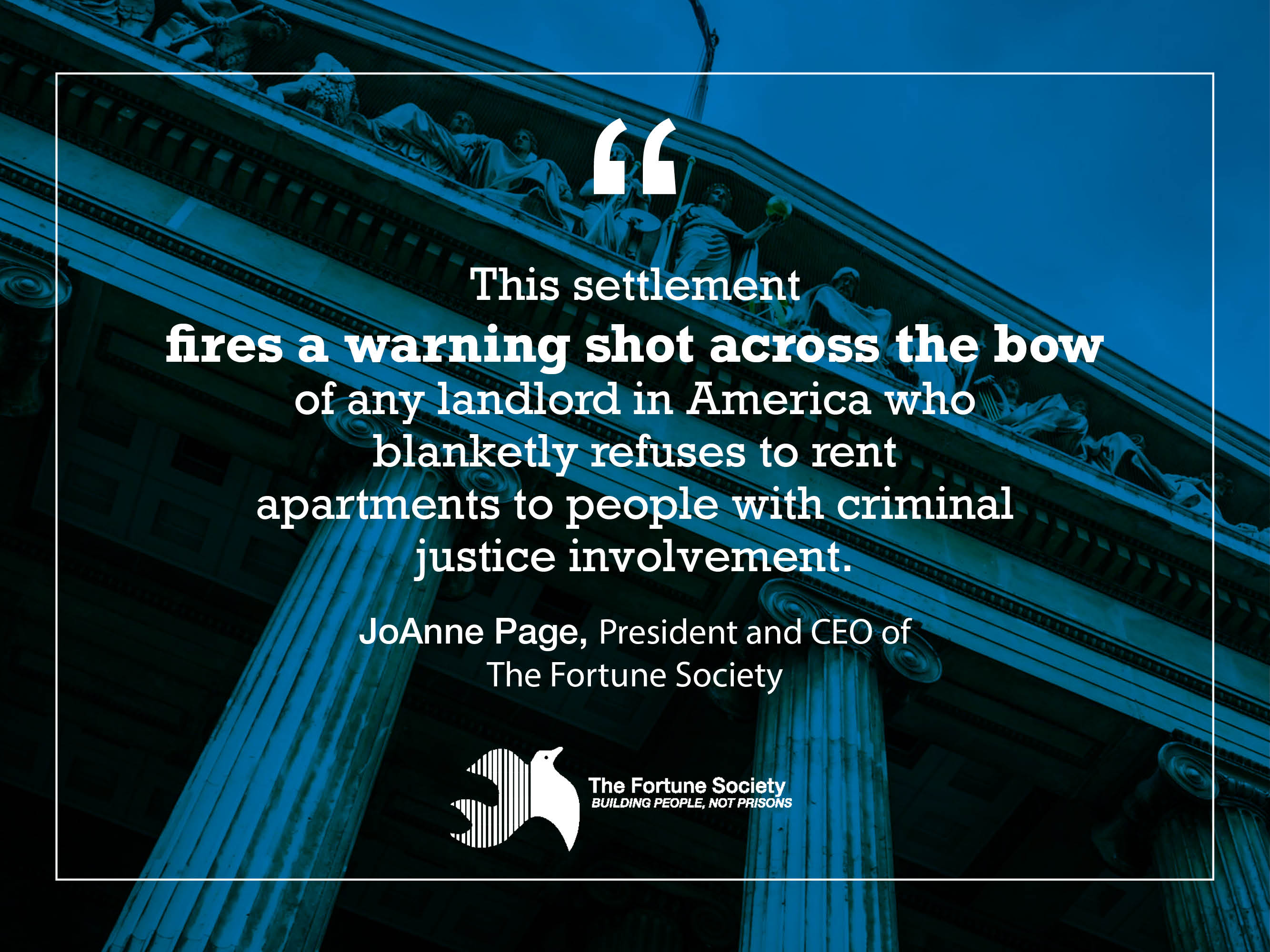 The Fortune Society announced today a precedent-setting settlement of a landmark federal civil rights case allowing advocacy groups to bring lawsuits against private landlords who impose blanket bans on renting apartments to people with criminal records.