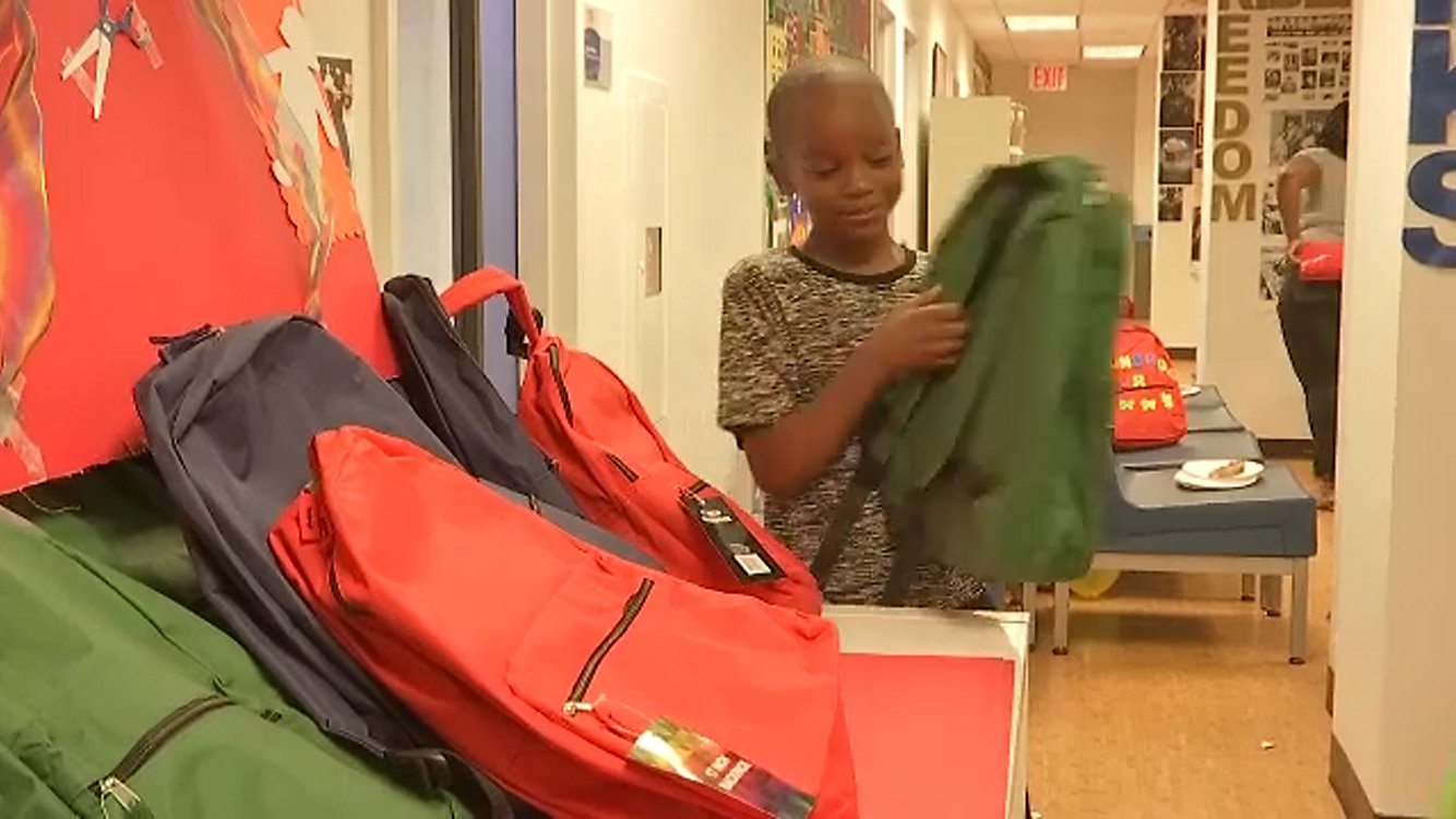 On Friday, at their Long Island City headquarters, the Fortune Society handed out new bookbags to children whose parents were once incarcerated.