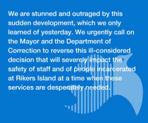 We are stunned and outraged by this sudden development, which we only learned of yesterday. We urgently call on the Mayor and the Department of Correction to reverse this ill-considered decision that will severely impact the safety of staff and of people incarcerated at Rikers Island at a time when these services are desperately needed.